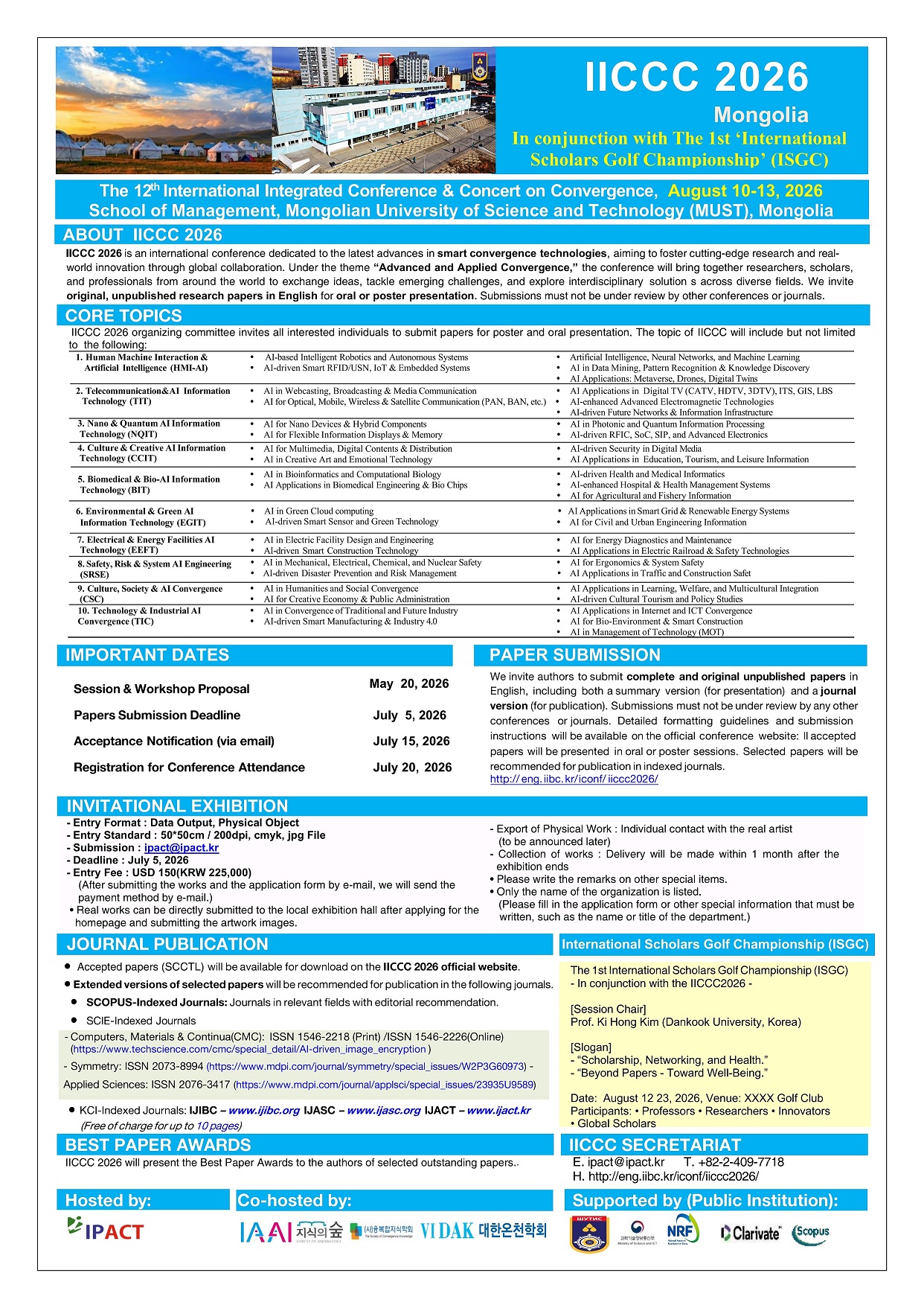 The IPACT's "Conference Calendar"lists upcoming international conferences, symposiums, and workshops of interestto engineers and scientists. For more inquiries about international conference,please contact us at ipact@ipact.kr